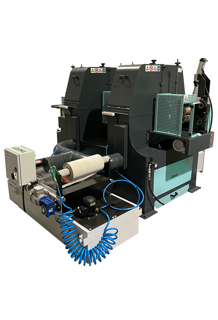 It features two grinding units mounted on a single baseframe: the first head performs efficient rough grinding, while the second grants superior finishing on straight parts with round, oval, elliptical, or irregular sections, processing stainless steel, iron, aluminium, brass, and other metals. This machine is particularly suitable for light alloys, aluminium, and titanium components.