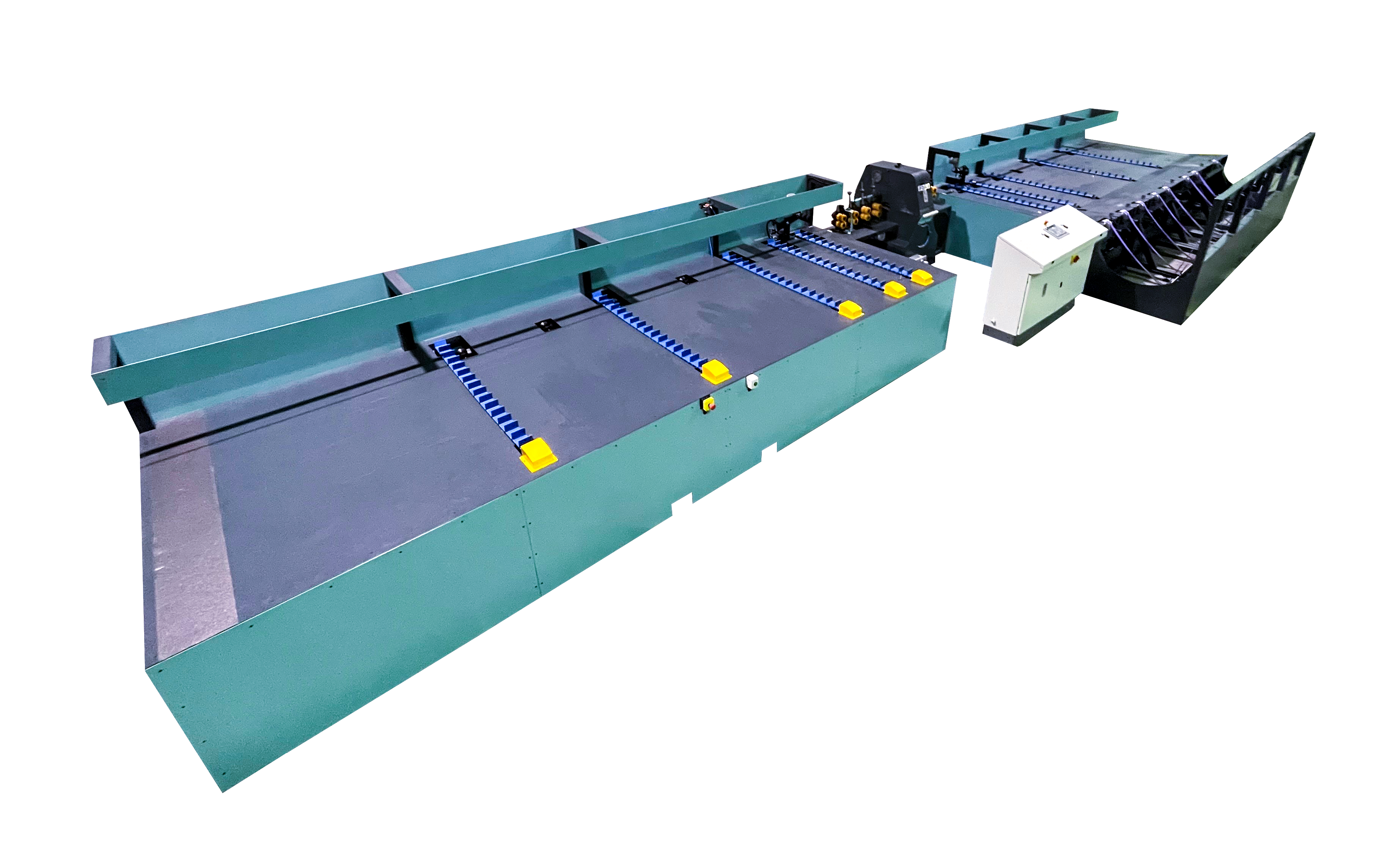 This BUNDLE loader, that normally operates with our standard step-by-step autoloaders, has special belts that hold weights up to 1000 kg and can move or adjust through a new generation PLC programming system.